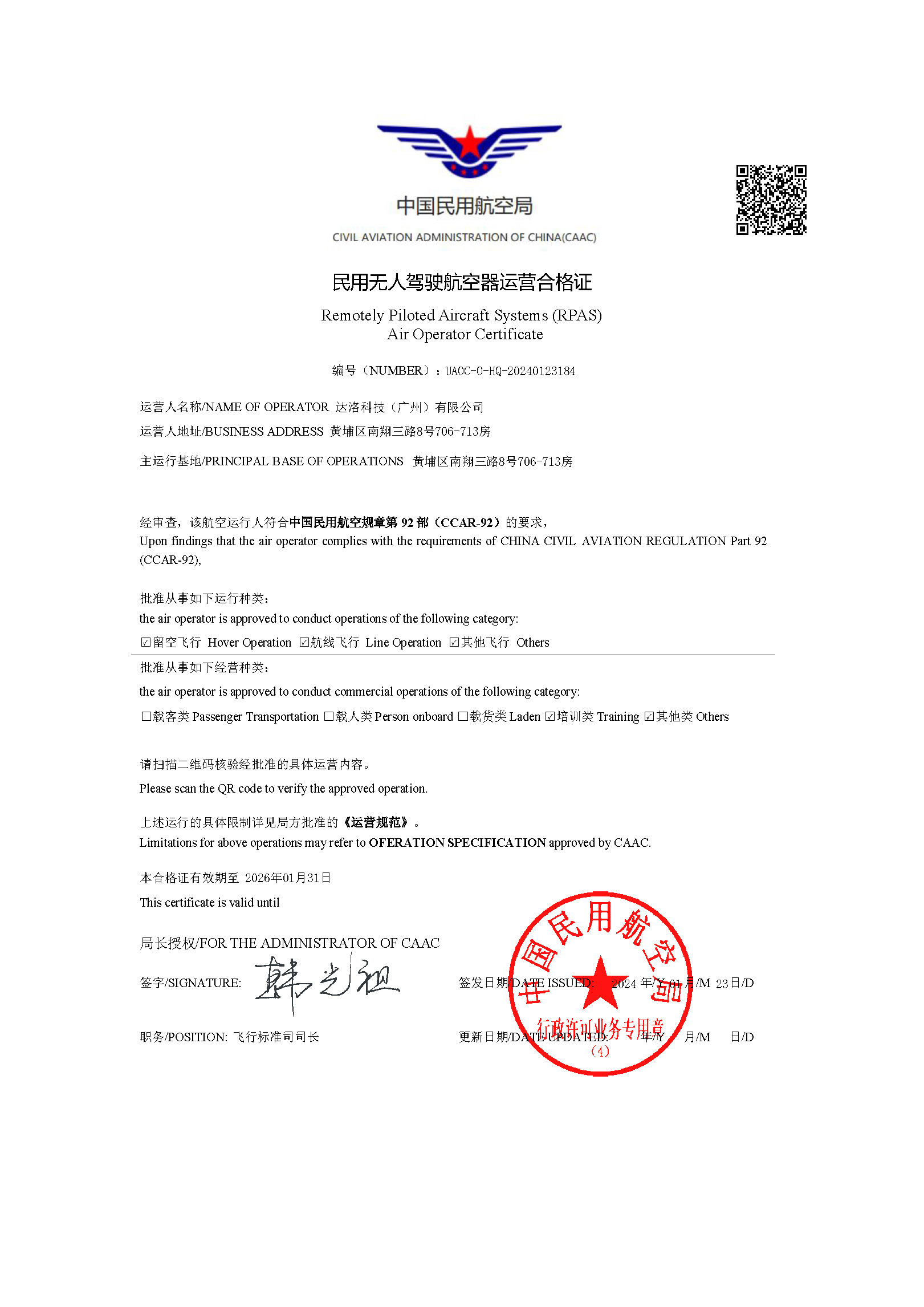 民用无人驾驶器运营合格证